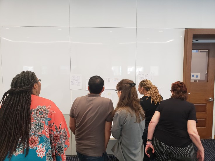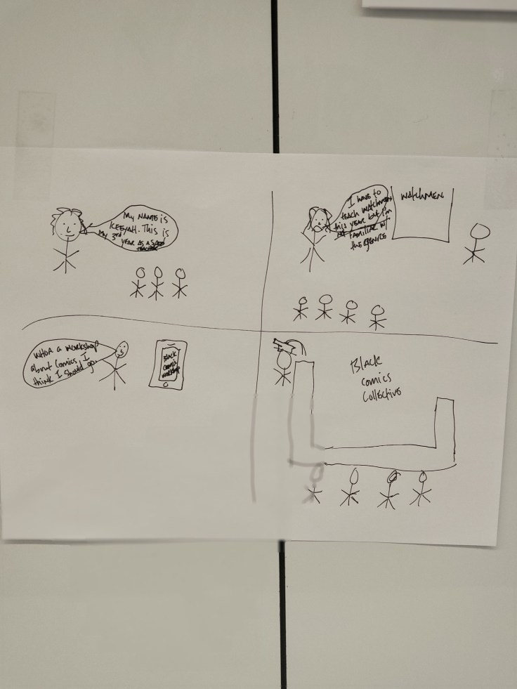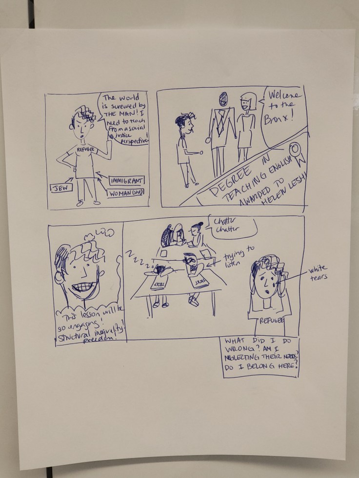 Participants were asked to post their comics on a wall for the group to view “gallery style”. We took our time and read each comic then I invited the creators to share a little about their pieces and their experience making them. What unfolded was the most amazing and unanticipated storytelling session. The creators were generous about sharing their reflections and their process. I could feel the community building around the participants as their risks and vulnerabilities were shared. I do have some of random video clips of the sharings and will transcribe them for further reflection.